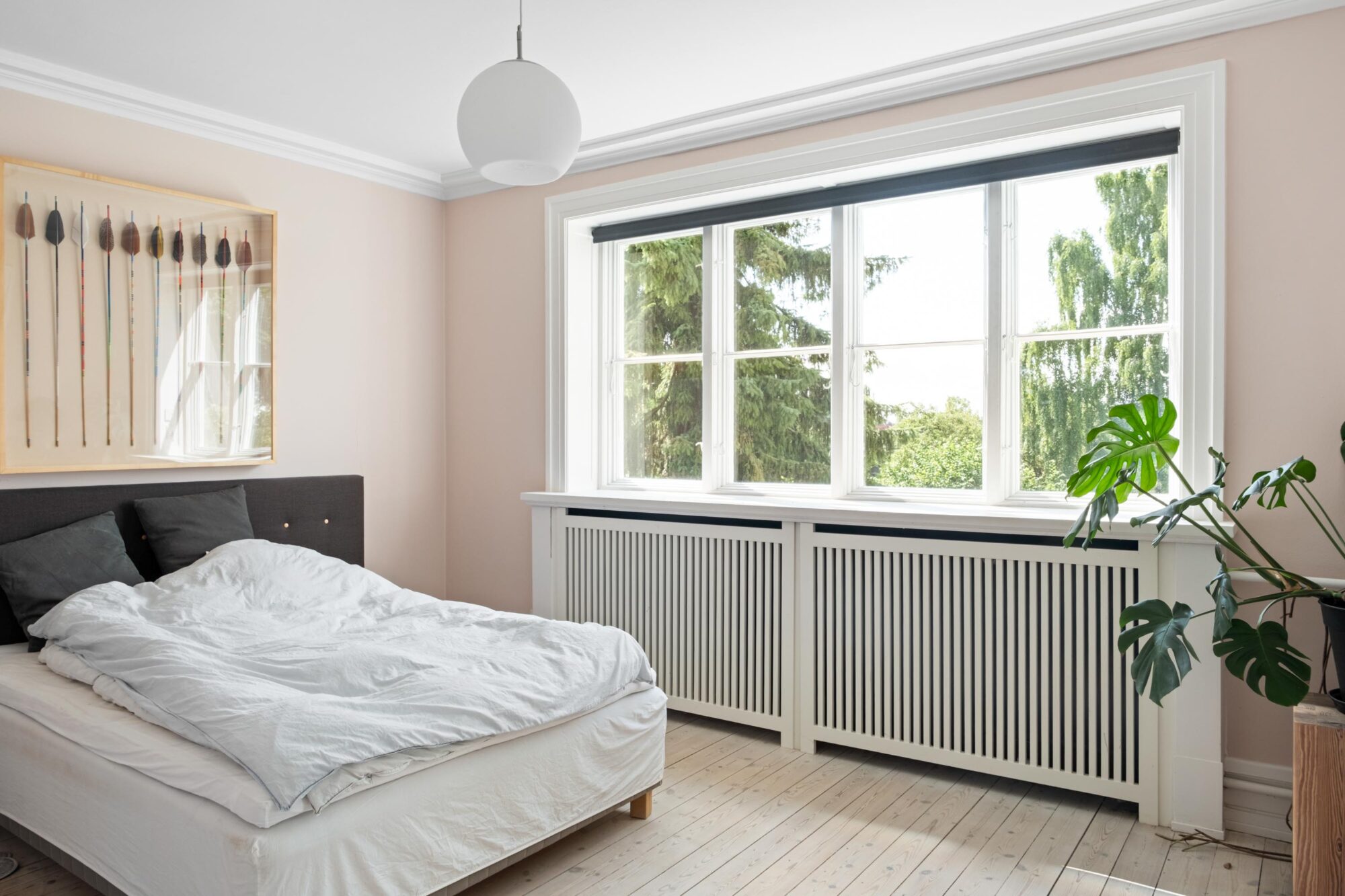 Førstesalen er helt uden skråvægge og byder på tre store børneværelser og et stort masterbedroom. Badeværelset med det fritstående badekar og udsigt til trækronerne excellerer med et gulv, hvor den grønne marmor er lagt som mønster i en travertinsten. Der er installeret natbelysning, der blandt andet kommer til syne i sæbeskålen, der er drejet i ét stykke marmor.