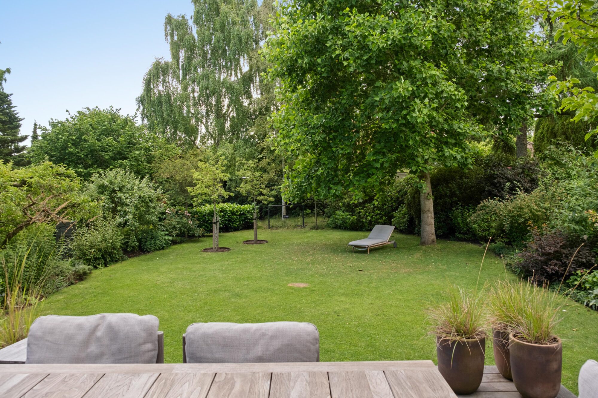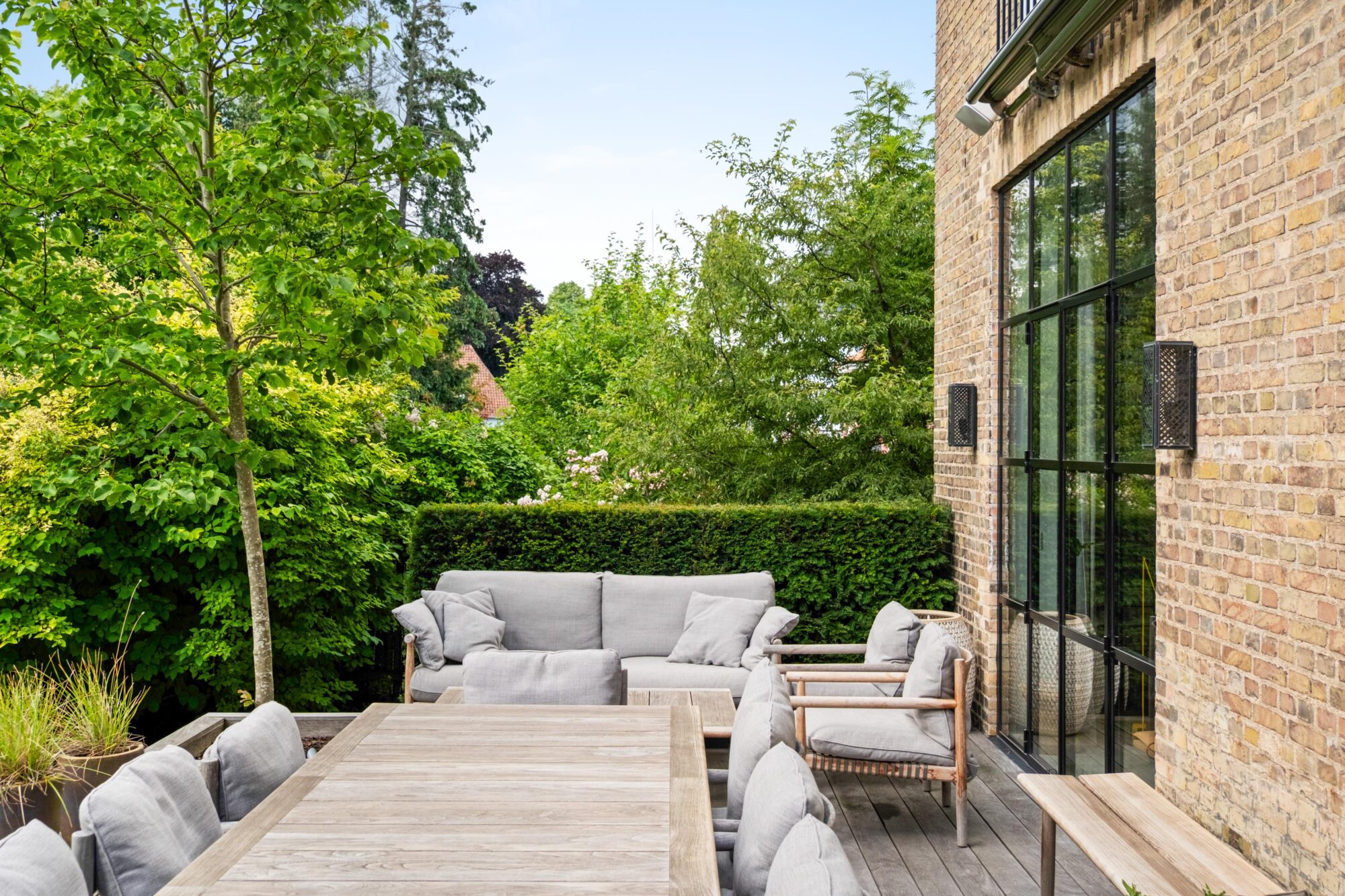 Terrassen har indbyggede lysløsninger og et udekøkken med vask og mahognilameller. Selv den grønne marmor er videreført herude med udsigt til den smukke private have med gammel beplantning. En kurateret havelyssætning giver liv til de smukke gamle træer i aftentimerne.