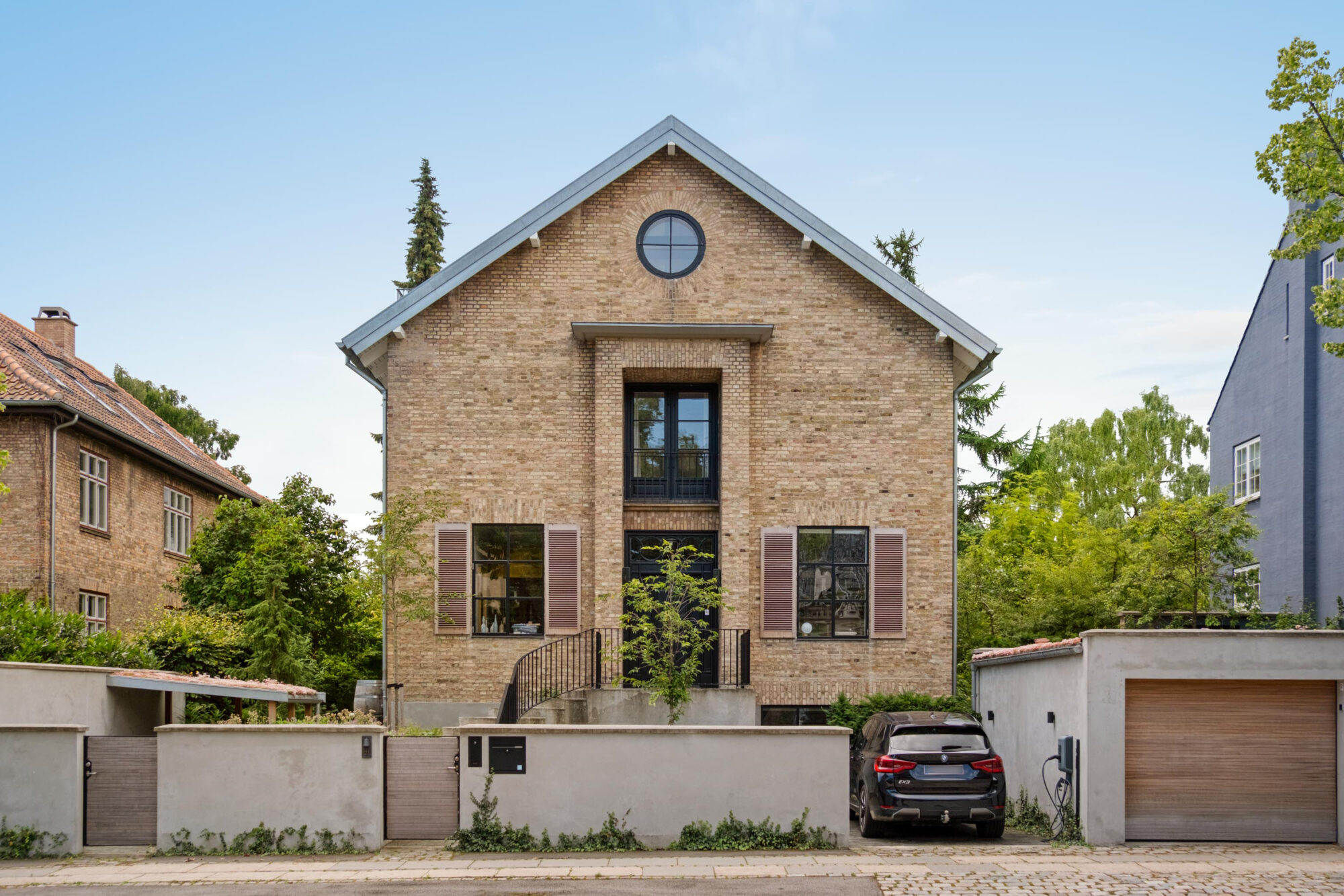Bygget i 1926 er huset født på ny med en omfattende renovering, der har stået på i næsten syv år for at stå som et gennemført stykke organisk kunstværk, hvor træ som bærende materiale går igen overalt. Kyndige hænder fra Københavns Møbelsnedkeri har, med en sjælden høj kvalitetsforståelse, leveret alt fra køkken til garderobeskabe og vinkælder. Selv radiatorskjulerne er bygget til huset af de yderst kompetente snedkere og toppet med smuk grøn marmor.