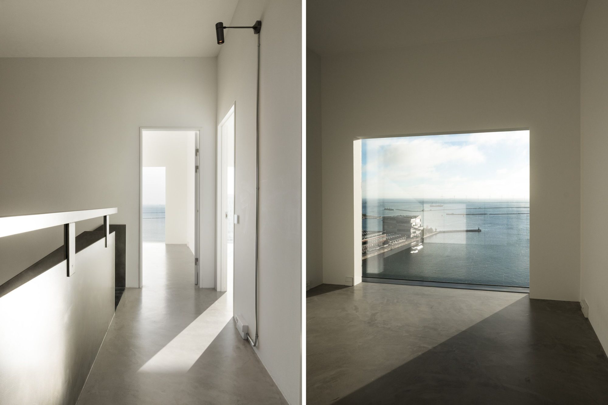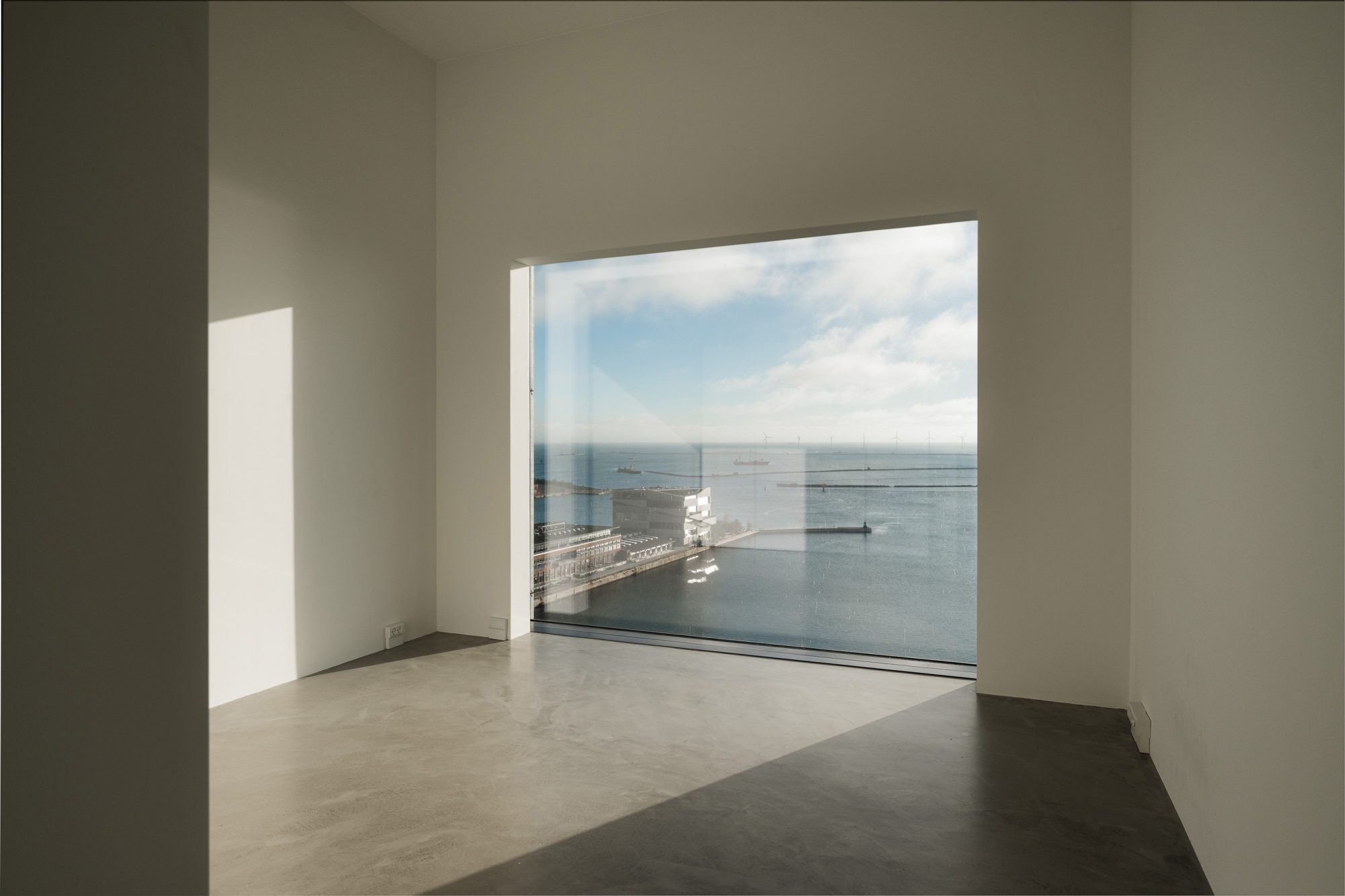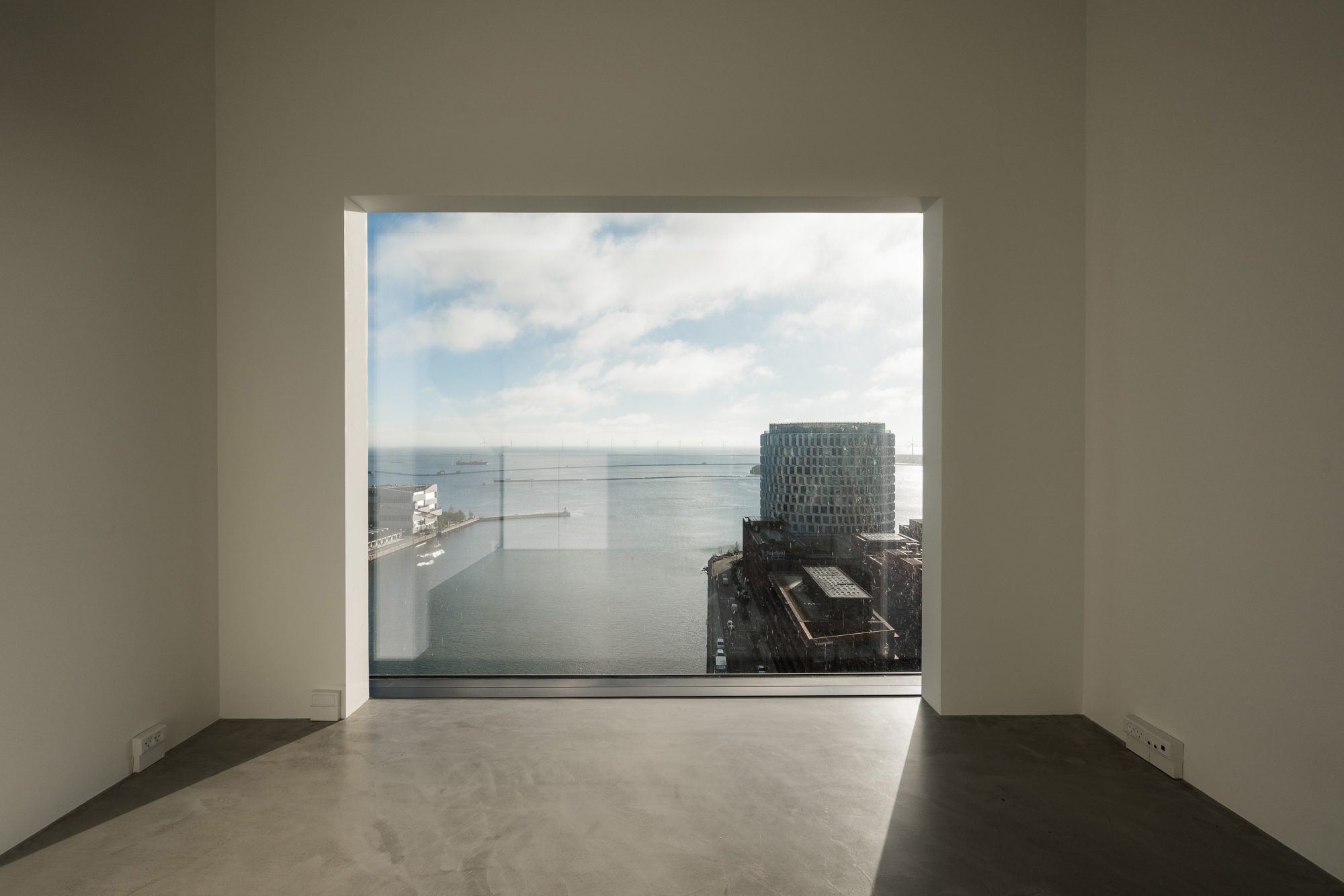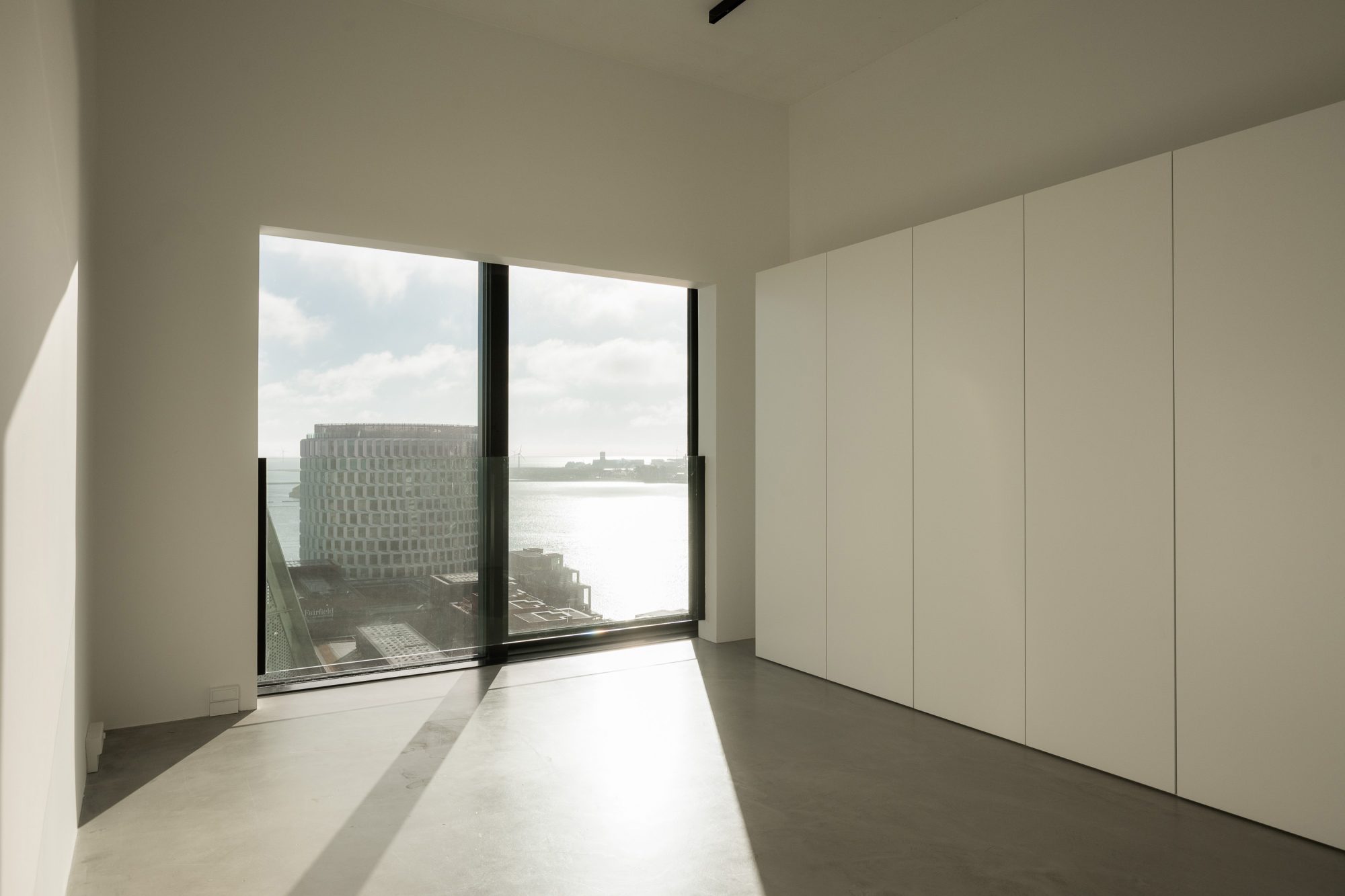 Den toetagers store lejlighed på 15. og 16. etage er en manifestation af hele grundtanken om ejendommen. Gennemgående lys, altaner mod både øst og vest, konsekvent og urban råhed og en loftshøjde, der fortæller, at dette ikke er en helt almindelig bolig. Lejligheden har gulvvarme overalt og de store panoramiske vinduer trækker byen og vandet helt ind i hjemmet med omskifteligt lysindfald døgnet igennem. Vinduerne er hæftet på ydermuren med udkig gennem den metertykke betonkonstruktion.