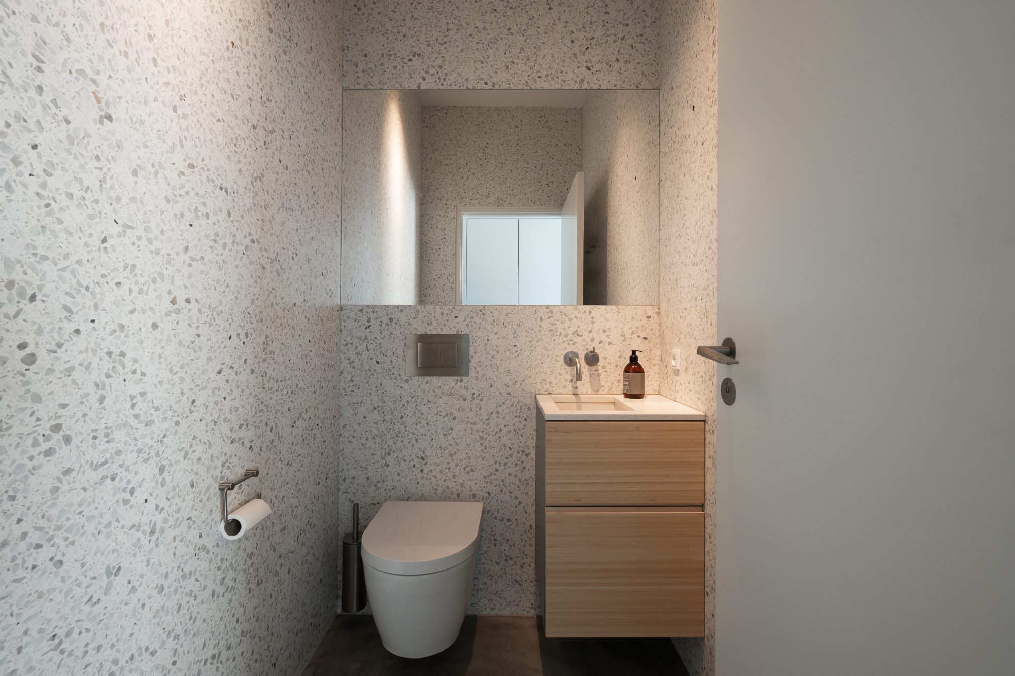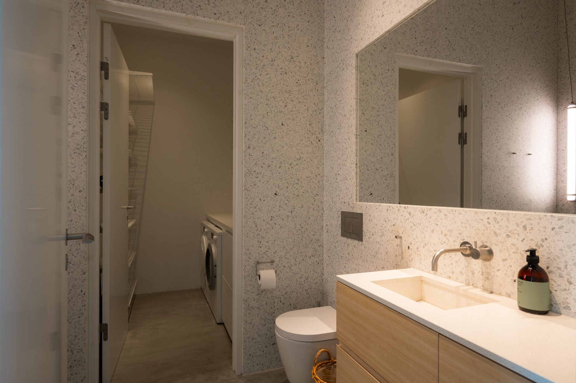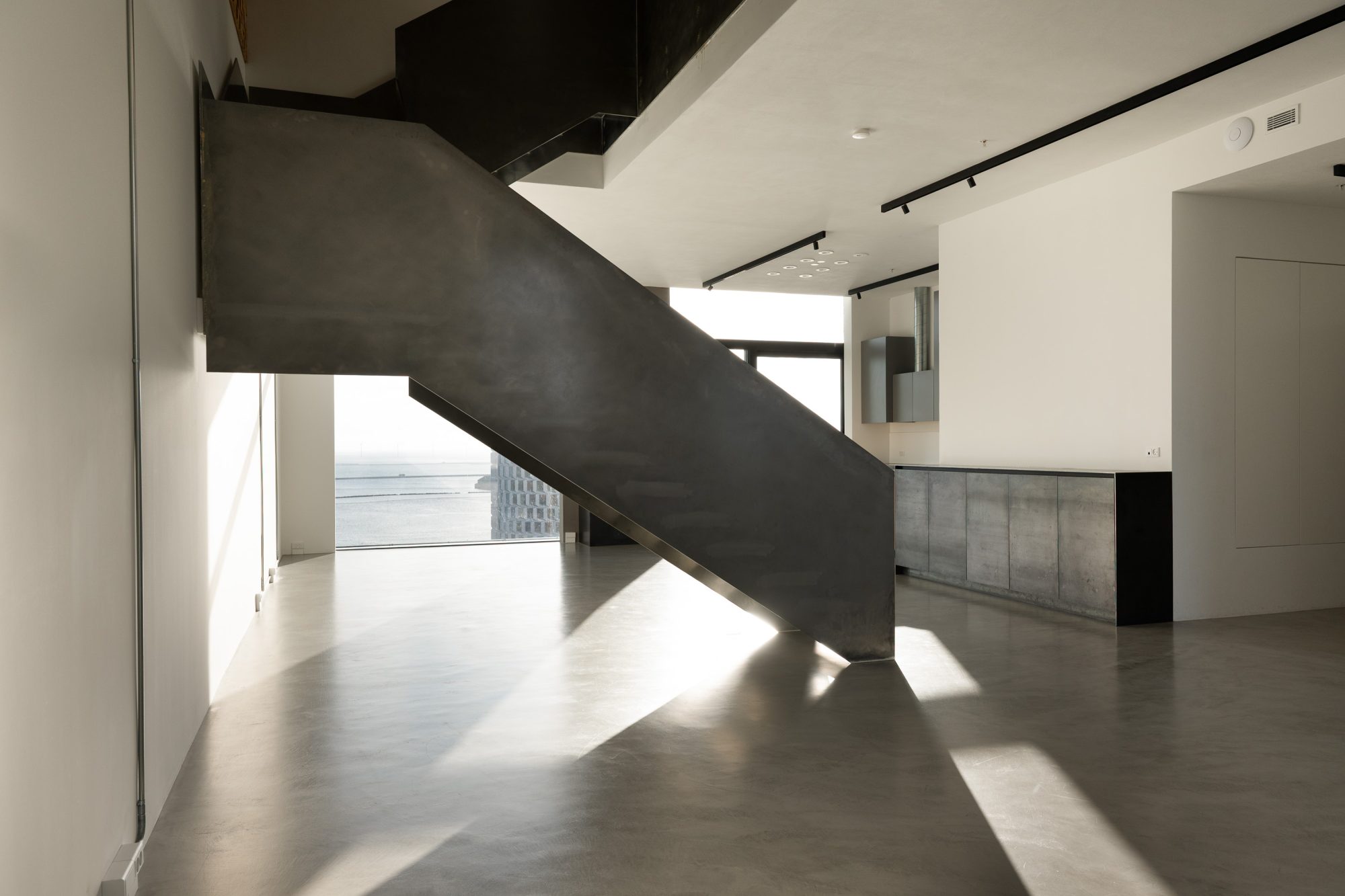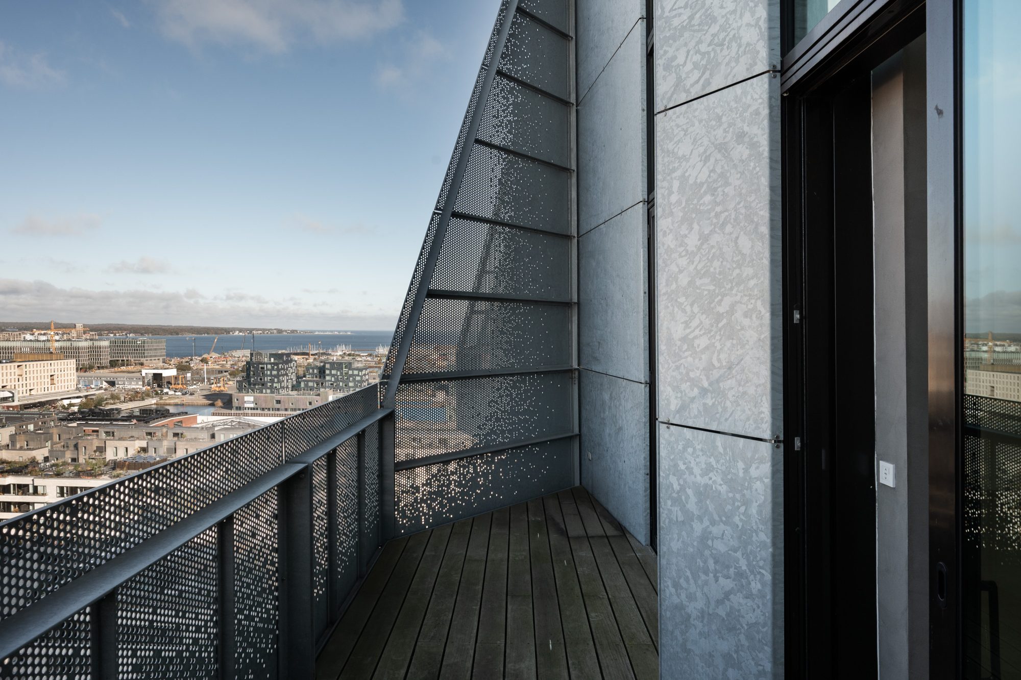 Den toetagers store lejlighed på 15. og 16. etage er en manifestation af hele grundtanken om ejendommen. Gennemgående lys, altaner mod både øst og vest, konsekvent og urban råhed og en loftshøjde, der fortæller, at dette ikke er en helt almindelig bolig. Lejligheden har gulvvarme overalt og de store panoramiske vinduer trækker byen og vandet helt ind i hjemmet med omskifteligt lysindfald døgnet igennem. Vinduerne er hæftet på ydermuren med udkig gennem den metertykke betonkonstruktion.