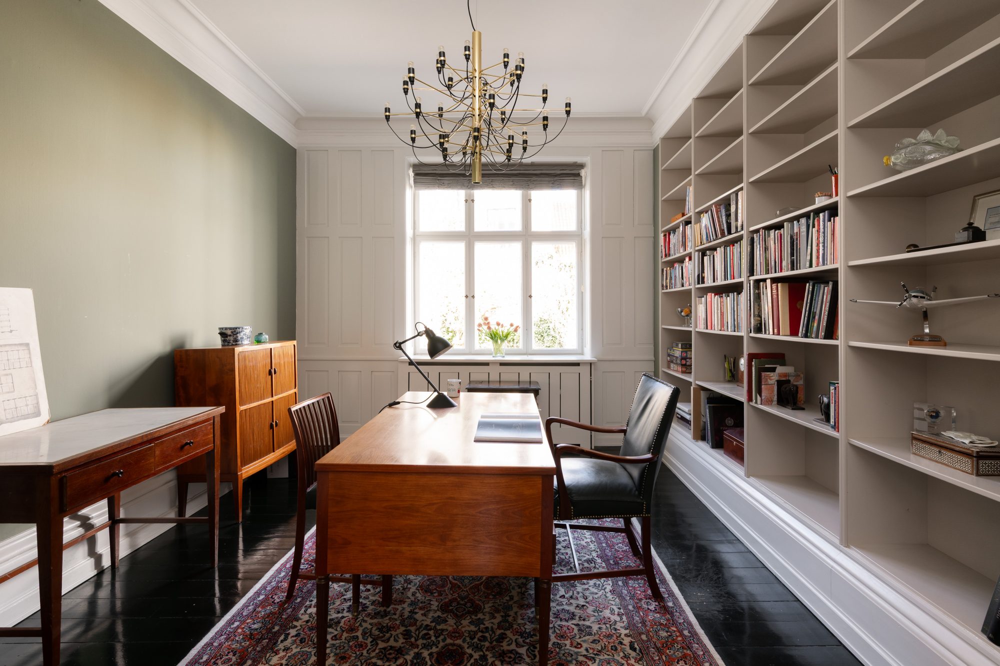 I stueplanet møder du spisestuen med rigeligt plads til de helt store selskaber og et herreværelse, som et hus af denne karakter selvfølgelig skal have. De to rum optræder i harmonisk samspil med husets øvrige proportioner og understreger, at her er tale om en bolig, der med sine smukke detaljer og høje paneler er repræsentation på absolut første klasse.